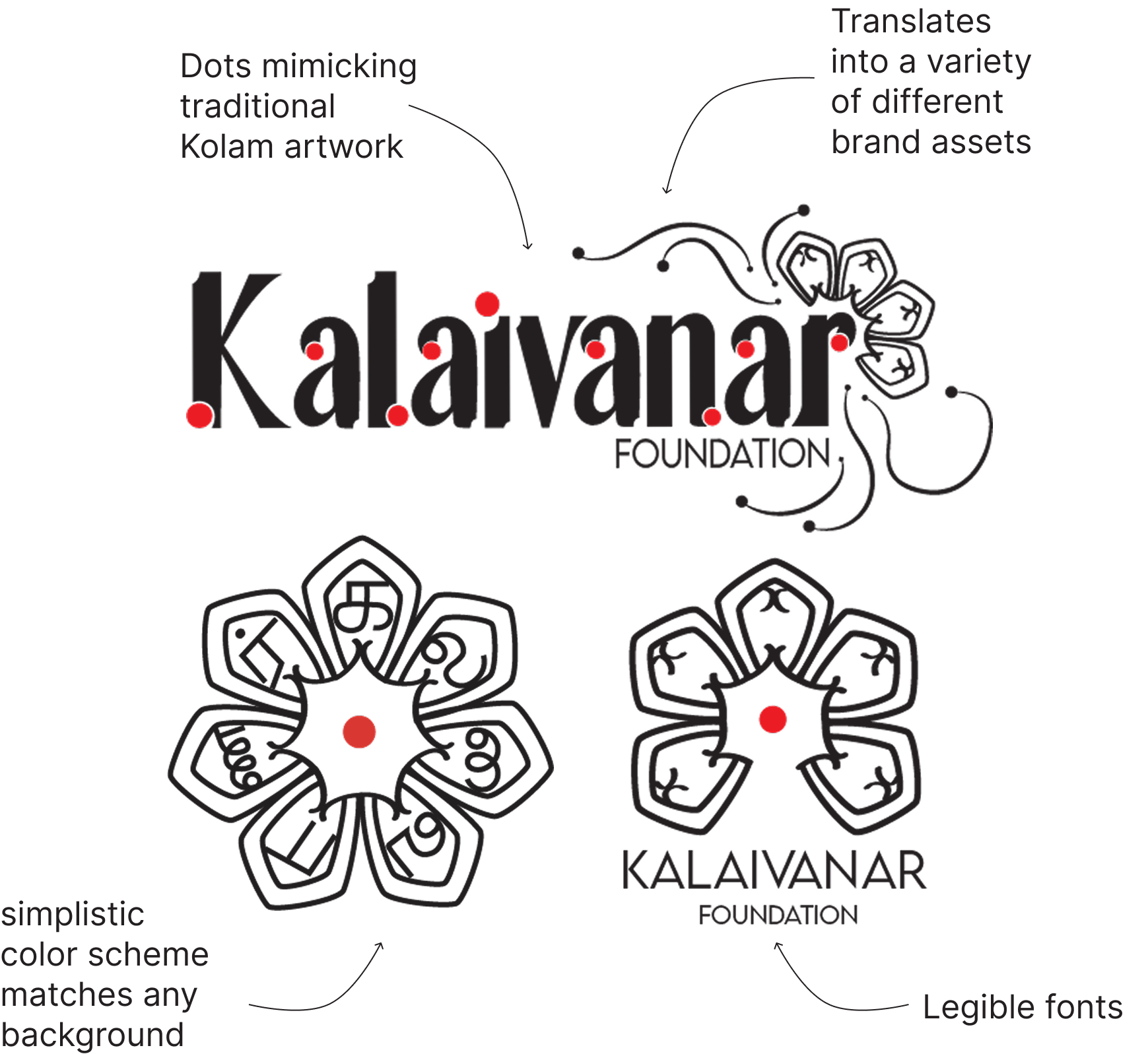 For this project, I decided to create a custom font which was clean and legible. Choosing a custom font allows me to incorporate dots or "Kolam", an artistic expression from the foundations Indian Heritage.